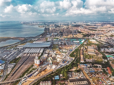 塔吊林立、车辆穿梭……如果站在青岛北站高处俯瞰,映入眼帘的是一片繁忙的施工建设景象。一旁的环湾大道上车流如织,进出青岛北站的客流络绎不绝,流动的人流、车流共同交织成一幅充满活力的发展图景。