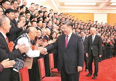 上午11时30分,习近平等来到人民大会堂北大厅,全场响起热烈掌声。习近平等同代表们亲切握手,不时交谈,并合影留念。