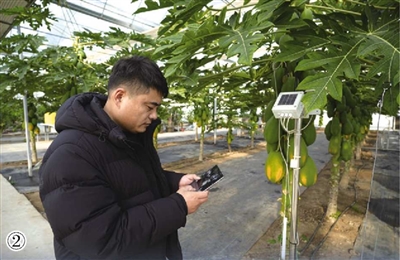 那么,原本生长在南方的水果,在这里不但适应了北方的气候,而且长势和品质更好,是什么原因?管立一道出了其中的奥妙:“整个园区才4个工人,装备了先进的物联网系统,可以实时监测和调控温室内的温度、湿度、光照等环境因素,为果树提供了最适宜的生长条件。工人们只需通过手机或电脑,借助农业物联网、农业大数据等数字技术,就能远程实现对园区的温室设备和作物的在线精准管理。例如,南果北种大棚要求最低温10摄氏度,低于10摄氏度的话,系统会通过模型计算,自动实现供暖。如果水分大了就会自动排湿,水分低了就会自动浇灌。”