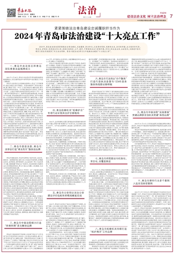 2024年,青岛政法战线紧紧围绕法治青岛建设,忠诚履职、担当作为,以改革的思路、创新的办法、务实的举措,全力做好防风险、保安全、护稳定、促发展各项工作,持续打造稳定、公平、透明、可预期的法治化营商环境,多项工作走在全国、全省前列,为推进中国式现代化青岛实践提供了有力法治保障。青岛日报《法治》周刊从中选撷法治建设“十大亮点工作”。