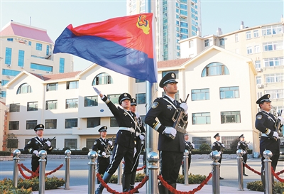 上午9时整,升警旗仪式正式开始。仪仗队员精神抖擞、英姿挺拔,迈着铿锵有力的步伐护送警旗入场。擎旗手挥臂扬旗,承载着荣誉和使命的警旗冉冉升起,高高飘扬。全体人员高唱《中国人民警察警歌》,并向警旗敬礼。升警旗仪式结束后,全体人员面向警旗,在全国公安系统二级英雄模范、市北分局一级高级警长马怀龙带领下,重温人民警察誓词。旗帜引领方向,誓词凝聚力量,展现出青岛公安护航新征程、建功新时代的良好精神风貌。