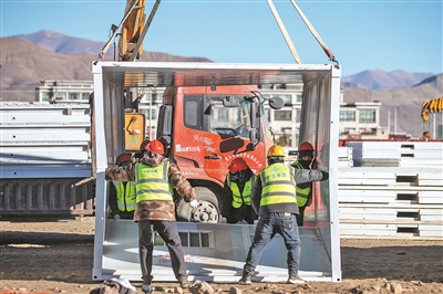 11时,运抵森嘎村安置点的40套暖白色房屋正在吊装。这批房屋自带防盗门和防盗塑钢窗,两窗相对,通风明亮,拼接处采用咬合式设计,密封保温。内置5孔插座、3孔插座、空调插座、漏电保护器和照明灯,每间建筑面积18平方米,接通外部电力后即可入住。