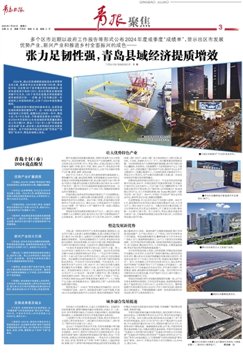 县域经济是中国经济的基本单元,也是促进区域协调发展的重要环节。这一份份简洁却不简单的政府工作报告,透露出在过去的一年中,青岛十区(市)守正创新,不断增强发展张力和韧性。在2024年印发的《山东省县域经济高质量发展试点工作方案》中,青岛三个区(市)入选“引领发展试点县域”名单,是全省入选该领域试点区县最多的城市。在不同机构评选出的全国“百强县”“百强区”名单中,青岛多地榜上有名。