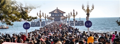 逛完中山路,一路向南,便来到了栈桥景区,这里在大年初一便开启“人山人海”模式,众多游客带着孩子前来喂食海鸥。来自江西的刘女士说:“我们猜到游客可能会多,但没想到有这么多,景区充满了年味,一家人玩得很开心。”
