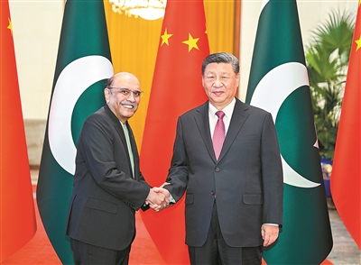 习近平指出,中国和巴基斯坦是铁杆朋友和全天候战略合作伙伴。历久弥坚的中巴传统友谊由两国老一辈领导人亲手缔造,是两国和两国人民的宝贵财富。近年来,双方坚定相互政治支持,保持密切高层交往,深入推进中巴经济走廊建设和各领域合作,树立了国与国关系典范。中方愿同巴方在各自现代化道路上携手前行,加快构建新时代更加紧密的中巴命运共同体,更好造福两国人民,为地区和平、稳定、繁荣作出更大贡献。