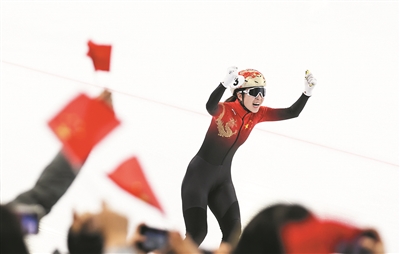 2月9日,中国队选手公俐在决赛后庆祝。当日,第九届亚冬会短道速滑女子3000米接力A组决赛在哈尔滨举行,中国队夺得冠军。