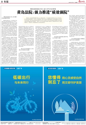黄岛区人民法院紧紧围绕“努力让人民群众在每一个司法案件中感受到公平正义”的目标,深入落实西海岸新区“一四四六”总体思路,严格公正司法,积极创优跃升,成功创建全省“司法为民示范法院”,获评青岛西海岸新区新时代社会主义现代化示范引领区建设先进集体、青岛西海岸新区高质量发展先进集体。2024年,全年共受理各类案件76829件,涉案标的325亿元,结案69803件。员额法官人均结案652件,居全省法院前列。