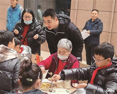 表演结束后,同学们围坐在老人身边,听他们讲述过去的事情,并和他们分享自己学习生活的点滴。待热气腾腾的饺子出锅后,学生们把饺子端到爷爷奶奶面前,一起品尝。