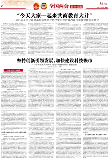 连日来,住青全国人大代表、青岛干部群众聚焦“坚持创新引领发展”这一话题展开热烈讨论。大家表示,要始终把科技创新摆在发展全局的核心位置,坚持“立足我所有、用好我所能、突出我所长、补齐我所短”,统筹推进教育科技人才一体化发展,努力打造具有核心竞争力的科技强市,为推进中国式现代化青岛实践提供坚实支撑。