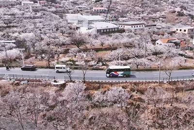 近日,随着崂山北宅街道万亩樱桃花绚烂绽放,2025青岛樱桃花节于漫山芳菲中启幕。本届樱桃花节将持续至4月中旬,“花海穿行”“国风入画”“百业生香”三大主题场景将自然景观、传统文化与市井烟火巧妙融合,推出集观赏性、文化性与体验性于一体的春日盛宴。图为温馨巴士赏花公交穿行在花海中。 刘 栋 摄