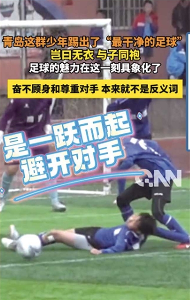 对于什么是“最干净的足球”,青岛富源路小学六年级学生、学校足球队前锋明玳蒙说,足球运动中的对抗是难免的,抢断球很正常,但不能“对着人下脚”,“我们的目的是抢下球。就像3号球员铲球的时候,并没有碰到对方球员的腿。”球队左后卫王宇轩则认为,在保持己方比分的同时,也要保护好自己和对方不受伤害,这样才能营造出和谐的比赛氛围,踢出最干净的足球。