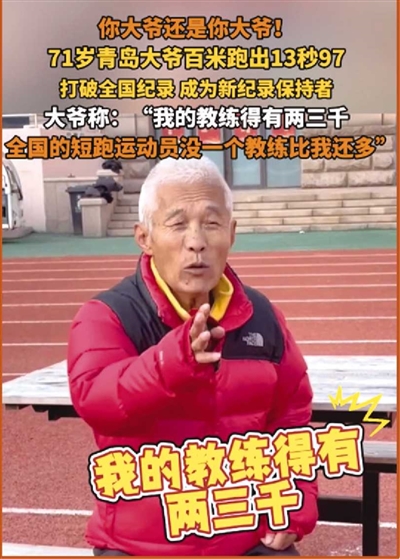 2025年3月8日,在WSE田径公开赛青岛站的跑道上,一位头发花白的老人以14秒45的成绩冲过终点线,将70岁老年组别百米赛的金牌收入囊中。而在去年底举行的2024全国田径大师赛上,这位老人刚以13秒97的成绩,打破其所在组别的百米全国纪录。他叫金辉,今年72岁,是田径圈内赫赫有名的“高龄飞人”。