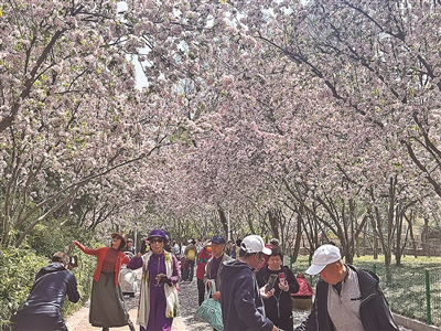 李村公园的海棠盛花期约两周。漫步百米花径,扑面而来的清香四溢令人沉醉,眼前是飘飞的花瓣,耳畔是游人的惊叹。海棠花为何能够吸引如此多的目光?或许正是因为那份独特的美丽:花苞珠圆玉润,似胭脂点点;花朵粉嫩娇艳,如晓天明霞。时光流转,此时盛放的海棠,散去了“知否,知否?应是绿肥红瘦”的怅惘,满是“红肥绿瘦”的欣喜。海棠树下,不少游客在纷飞的花瓣雨中起舞。