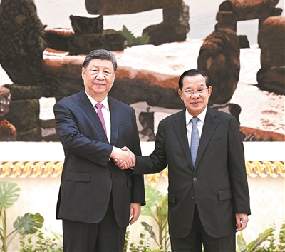 习近平指出,中柬友好跨越千年,两国人民始终双向奔赴、相互成就。无论国际风云如何变化,中柬两国坚守信义、守望相助,在涉及彼此核心利益和重大关切问题上始终坚定相互支持,树立了大小国家平等相待、真诚互信、互利共赢的典范。中柬两国始终走在构建人类命运共同体前列,给柬埔寨民众带来实实在在的好处。
