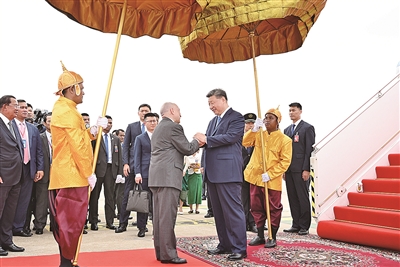 习近平乘专机抵达金边国际机场时,西哈莫尼国王率夏卡朋亲王、阿伦公主等王室成员,人民党主席、参议院主席洪森,国会第一副主席钱业以及郭索帕、布拉索昆、韩春那洛、韶索卡、洪玛尼等五位副首相在机场热情迎接。礼兵分列红毯两侧。柬埔寨王室珍娜公主向习近平献上茉莉花手环,女青年沿途向红地毯抛撒花瓣。