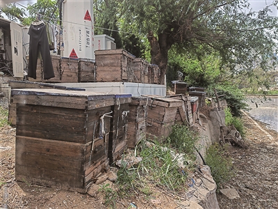 记者闻讯后赶到大村河畔的一处槐花林,看到沿河密密麻麻地摆放着七八十个蜂箱。据蜂农介绍,他老家在安徽黄山,每年3月都会和家人从老家启程,循着花期一路北上,途经南京、徐州、临沂等地,来到青岛。因为这片槐花林树龄大、面积广,每年这个时候,他们都会在此驻留一个月采集槐花蜜。按照计划,大约一周后他们会前往潍坊,采集荆条花蜜。