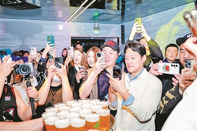 “打啤酒竟然要分9步,又是长知识的一天!”吧台前,韩国经销商李树焕认真听着讲解,将酒杯45度角倾斜放置、手持杯底1/3处、打酒酒口距离杯子内壁高度固定在3厘米……侍酒师娴熟的手法和每一个精细的步骤,都让李树焕感到新奇。