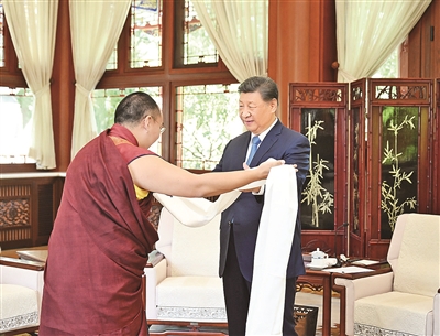 班禅向习近平敬献哈达,介绍了他近年来的学习工作情况。习近平对他在各方面取得的进步表示祝贺。