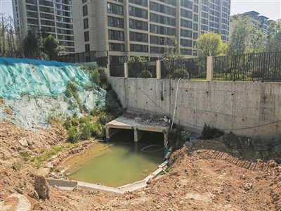 “这里本来是一处缓坡,暗渠埋在地下。去年7月下大雨,暗渠处被冲毁下陷形成深坑,小区围墙也受损,水倒灌进地下停车场。”张先生说,目前暗渠淤塞问题还没有解决,眼下雨季临近,居民担心小区再遭水淹。