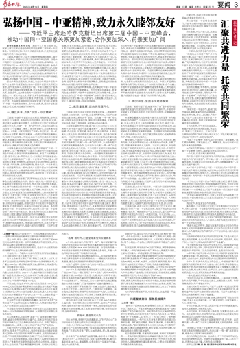 本届峰会最突出的亮点是习近平主席宣布“中国-中亚精神”。这一精神植根于六国在长期合作中形成的共同理念和价值,由各方共同探索提炼而成,彰显了六国循睦邻之愿、强信任之基、聚团结之力、行互助之举的坚定意志。习近平主席精辟概括了“中国-中亚精神”的核心要义,即坚持相互尊重、平等相待;坚持深化互信、同声相应;坚持互利共赢、共同发展;坚持守望相助、同舟共济。中亚各国元首一致同意秉持这一精神,强化中亚同中国合作的精神凝聚力和理念向心力,锚定构建命运共同体目标,以更加进取的姿态、更加务实的举措加强合作,推动中国-中亚机制不断取得新的更大发展。
