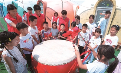 | ■7月17日,在山东省邹平市台子镇,参加“哆咪屋”暑期公益托管营的小朋友练习打鼓。 新华社照片 |