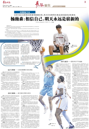 杨瀚森:我在青岛男篮的两年是收获巨大的两年。俱乐部和教练组一直为我量身定制培养方案,这能帮助我更快地补上短板。比如,球队聘请外教仔细打磨我的脚步与篮下技术,教练组也对我的体能、力量等短板实行针对性补强。同时,经过CBA联赛的历练,无论是场上的技战术、体能还是心态,我都有巨大的进步。