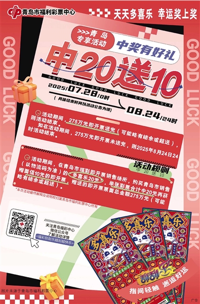 “中20送10”!青岛专享福利同步放送。活动期间,在青岛市福彩即开票销售场所,购买青岛市销售(以物流码为准)的“多喜乐20元”,单张彩票合计中20元再获赠面值10元的即开票,赠送的即开票票面总金额275万元(可能略有结余或超送)。