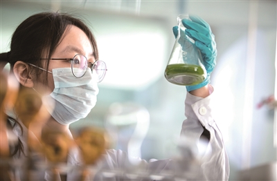 因为蛋白质含量高和叶绿素丰富,蛋白核小球藻已成为热销的新资源食品。青岛琅琊台集团历经多年研发,进一步大幅提高了小球藻中的蛋白质含量,同时不断优化培养工艺、调控环境参数,成功突破规模化培养技术,在发酵罐内实现了小球藻的规模化生产。时常作为儿童食品卖点的DHA(二十二碳六烯酸),可以从裂壶藻中提取,琅琊台集团同样将其含量提高并实现规模化生产。在该集团展厅内,以小球藻和海洋微藻DHA为添加物的食品琳琅满目。