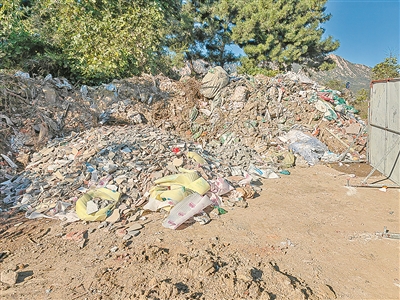 记者在现场看到,高女士家的耕地位于崂山区珠顶山北侧山下,距荷花村不足百米,距常家村近1公里,西边地块栽种了茶叶,北边地块则堆放着建筑垃圾和生活垃圾,形成一条长15米、宽5米的垃圾带。垃圾带北侧是荷花村的入村主路,部分垃圾溢到路面,影响车辆通行。记者采访时,恰好遇到一位荷花村村民推着小推车在此倾倒建筑垃圾。