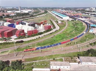 在上合示范区多式联运中心,一条条钢轨交错着伸向远方,货场内巨大的龙门塔吊正在忙碌地装运各种集装箱,“中国制造”“青岛制造”从这里启程快速进入全球市场;哈萨克斯坦小麦粉等“上合好物”也在这里集散流通进入中国。