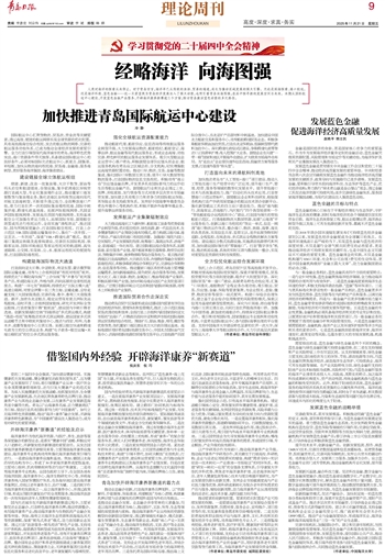 人类对海洋的探索从未停止。对于青岛而言,海洋早已从传统的渔场、贸易的通道,成长为推动区域发展的强大引擎。无论是深海探索、港口航运,还是海洋科技、蓝色金融……这一片蔚蓝既为青岛经济发展注入了强大动能,也吸引着青岛向海图强,在其中探寻新的发展空间与未来。本期从国际航运中心建设、开发蓝色金融产品服务、开辟海洋康养新赛道三个方面,探讨青岛激活蓝色动能的多元路径。