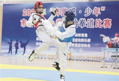 ■日前,市北区“奔跑吧·少年”中小学生跆拳道比赛在青岛同德小学体育馆落幕。来自全区70余所学校的近500名选手参赛。经过两天的激烈角逐,青岛滨海学校小学部、青岛明德小学和青岛崇德小学分别斩获小学组团体前三名;青岛超银中学(金沙路校区)、市北实验初级中学及第五十中学取得初中组前三名。 韩 星 摄