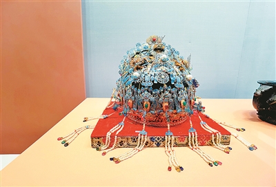 青岛市博物馆这顶镀金点翠凤冠长25厘米,宽19厘米,高22厘米,除了华美富丽的造型,冠后上部錾有“奉天诰命日,官诰重封月”十字,下有两名手持如意的朝官,冠底雕有双龙相托。尤其值得一提的是,除凤冠之外,与之配搭的另有“奉天诰命”木箱保存至今,其文物意义与历史价值弥足珍贵。