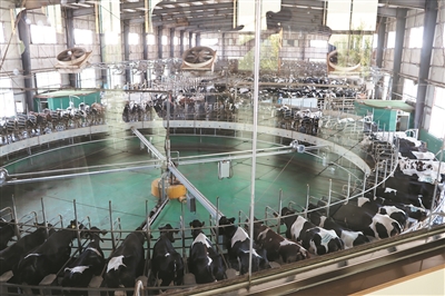 田瑞集团自主研发的6列12层集约智能化鸡舍,实现“单人管理15万只鸡”;牧原公司建成全省首个6层30米高智能化养猪楼房,全程机器人饲养,年出栏10万头,占地仅80余亩;博宇牧业智慧奶厅里,80位转盘式挤奶机宛如一座精密运转的“乳业时钟”,每小时能完成500头奶牛的挤奶任务……