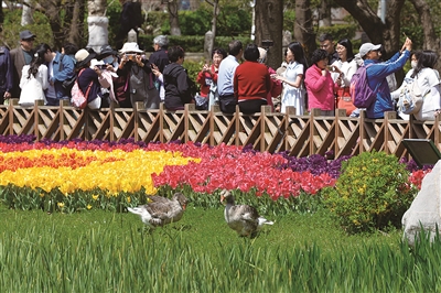 近日,中山公园的郁金香迎来盛花期,百余个品种、各种花色错落排布、鲜艳夺目,吸引了众多市民游客前来观赏。据工作人员介绍,郁金香花期将持续至本月下旬。