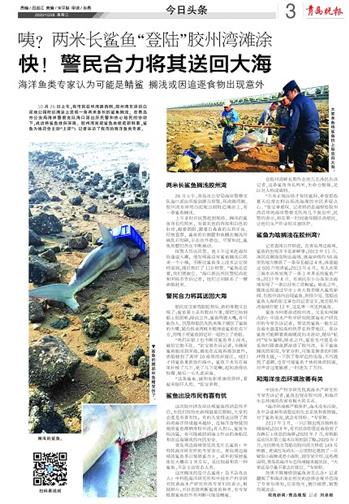 10月26日上午,有市民在环湾路西侧、胶州湾东岸的白泥地公园附近滩涂上发现一条两米多长的鲨鱼搁浅。在青岛市公安局海岸警察支队海口派出所民警和热心船民的协助下,成功将鲨鱼放归深海。胶州湾发现鲨鱼本就是新鲜事,鲨鱼为啥还会主动“上岸”?记者采访了我市的海洋鱼类专家。