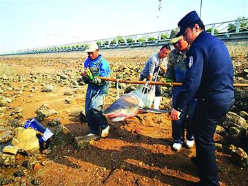 船民张宝章驾船赶到后,新的难题又出现了:鲨鱼看上去有数百斤重,要把它抬到船上很困难;除此之外,鲨鱼咧着大嘴,有可能伤人。民警和船民先找来绳子捆住了鲨鱼的大嘴,随后找来两根木棍伸进鲨鱼肚皮下方,用绳子将鲨鱼固定好一起抬上了渔船。