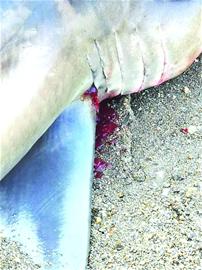 上午8时许民警赶到现场。搁浅的鲨鱼身长约两米,有着灰色的背部和白色的肚皮,瞪着圆眼,露着白森森的尖利牙齿。仔细查看,鲨鱼的右侧腮和鱼鳍在搁浅时被乱石划破,正在往外渗血。尽管如此,鲨鱼的腮仍然在不断抽动。