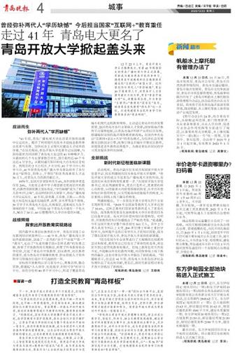 12月22日上午,青岛开放大学正式揭牌成立。有着41年辉煌历史的青岛广播电视大学正式落幕,更新成为服务青岛市民终身学习、推进青岛开放教育和社区教育体系建设的“互联网+”新型大学。这所曾经弥补两代人“学历缺憾”、育出30万高素质人才、对青岛市人力资源贡献巨大的大学,更名“青岛开放大学”后,将整装再出发,作为青岛“互联网+”教育的“国家队”成员,瞄准青岛在线教育“排头兵”这一目标,打造构建服务全民终身学习的教育体系的“青岛样板”。