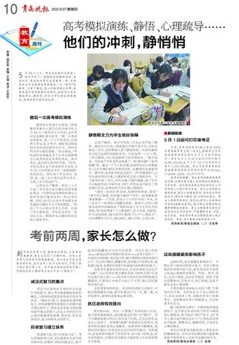据青岛实验高中分管高三级部教学发展中心副主任徐会强介绍,5月26日三模考试正式开始,这次考试完全模拟真实高考。 “第一天考语文和数学、第二天下午考英语,后面两天考‘6选3’科目。模拟考试期间的空余时间安排学生自习,同时老师为学生做好答疑。 ”徐会强说,“学校这样安排就是为了让学生能够真正以高考的状态来参加考试,面对考试,适应真实高考的节奏。 ”同时,学校本周末也不再安排学生返校,5月31日学校将会举行 “金榜高粽”传统活动,届时高三学生家长、老师、高一高二学生等均会参与其中,为高三学子加油打气。