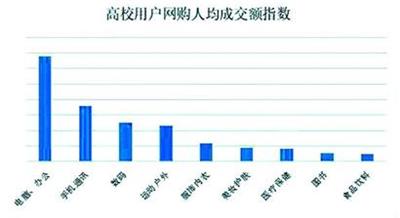 从人均成交额来看,大学生在电脑办公、手机通讯、数码产品上的开销最大。过去的一学年里,网购电脑的大学生用户数超过网购文具的用户数1.1倍。