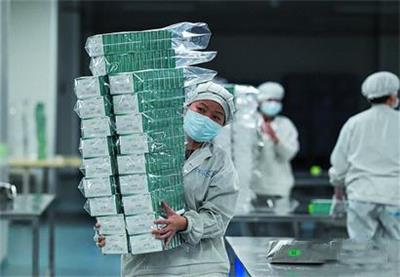 医务人员在一家药企公司搬运药物。