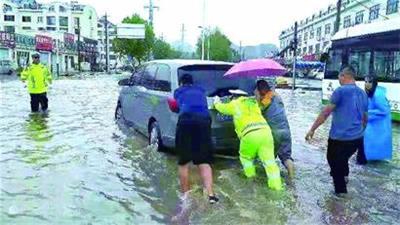 暴雨导致青岛西海岸新区部分道路出现大面积积水。青岛开发区交警大队民警在现场指挥巡逻中,发现汽车抛锚,车主进退两难,交警立即让车主下车,合力推车数百米,将车移至安全地点停放。