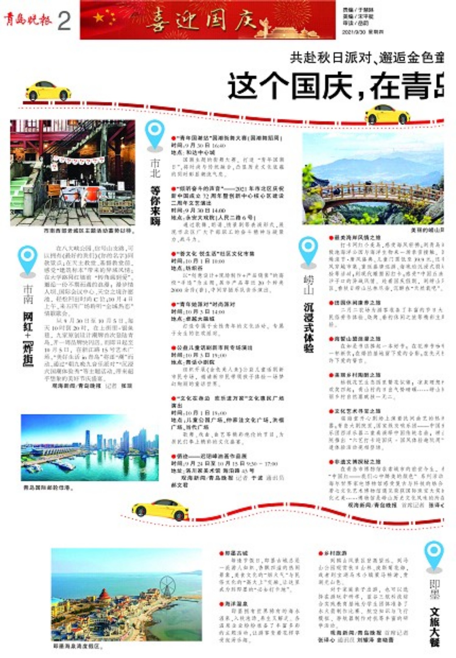 从9月30日至10月5日,每天10时到20时,在上街里·银鱼巷,九家原创设计潮牌首次登陆青岛,开一周品牌快闪店。而即日起至10月5日,在浙江路15号艺术广场,“美好生活in青岛”将逐“潮”而动,通过“朝九晚九音乐派对”“沉浸式国潮体验秀”等主题活动,带来超乎想象的美好节庆盛宴。观海新闻/青岛晚报 记者 张琰