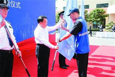 青岛市副市长,市公安局党委书记、局长隋汝文为首次亮相的青岛公安金盾志愿服务队和局属的5支金盾特色志愿服务队授旗。
