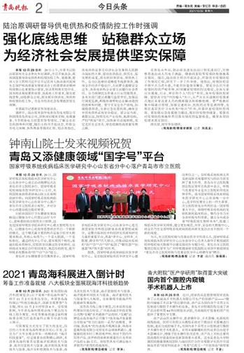 青岛市卫生健康委主任薄涛表示,国家呼吸系统临床医学研究中心山东省分中心是完善国家医学科技创新体系的重要组成部分,是整合临床医学科技研究资源和研究力量的重要平台,具备“多中心、全样本、大数据、跨学科”四大特点,对推动临床疾病的“防”“诊”“治”“研”起到了“孵化器”“加速器”和“放大器”的作用。