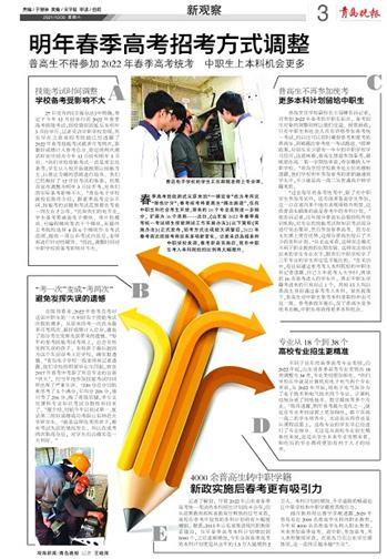 “择优计分”;春考统考将普高生“踢出跑道”,仅向中职生和社会考生开放;原来的18个专业类别进一步细分,扩展为38个类别……近日,《山东省2022年春季高考统一考试招生技能测试工作实施办法》(以下简称《实施办法》)正式发布,招考方式出现较大调整后,2022年春考首次技能考将迎来多项新变化。记者采访岛城多所中职学校发现,春考新政实施后,我市中职生考入本科院校的比例将大幅提升。
