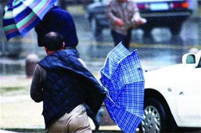 路人风雨中艰难前行,雨伞被吹翻。徐常青 摄