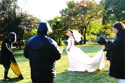 8日下午,在百花苑拍婚纱照的摄影师穿上了厚厚的冬装。徐常青 摄