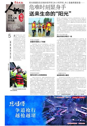 今年7月,河南多地遭遇罕见强降雨天气,内涝严重。杨学君得知消息后,迅速带领队员驰援河南新乡,奔赴抗洪救灾一线。杨学君告诉记者,驰援河南共分为三个梯队,大家携带两艘冲锋舟、消毒水500斤、酒精300斤等物资以及两只搜救犬,还有矿泉水、两百箱方便面等物资。水灾过后是传染病的高发期,新冠肺炎疫情还未过去,灾后的防疫工作尤为重要。杨学君等人在完成抗洪救灾任务后,继续留在河南进行灾后防疫消杀工作,直至所有任务完成后返回青岛。在河南,杨学君和队员们通过无人机红外成像等技术帮助,将被困水中的人员救出。因为长时间浸泡在水中,大家的双脚都有些浮肿。阳光救援队的队员平时都有自己的工作,来自各行各业,一旦有救援任务,就会放下手里的工作,积极参与到救援中。